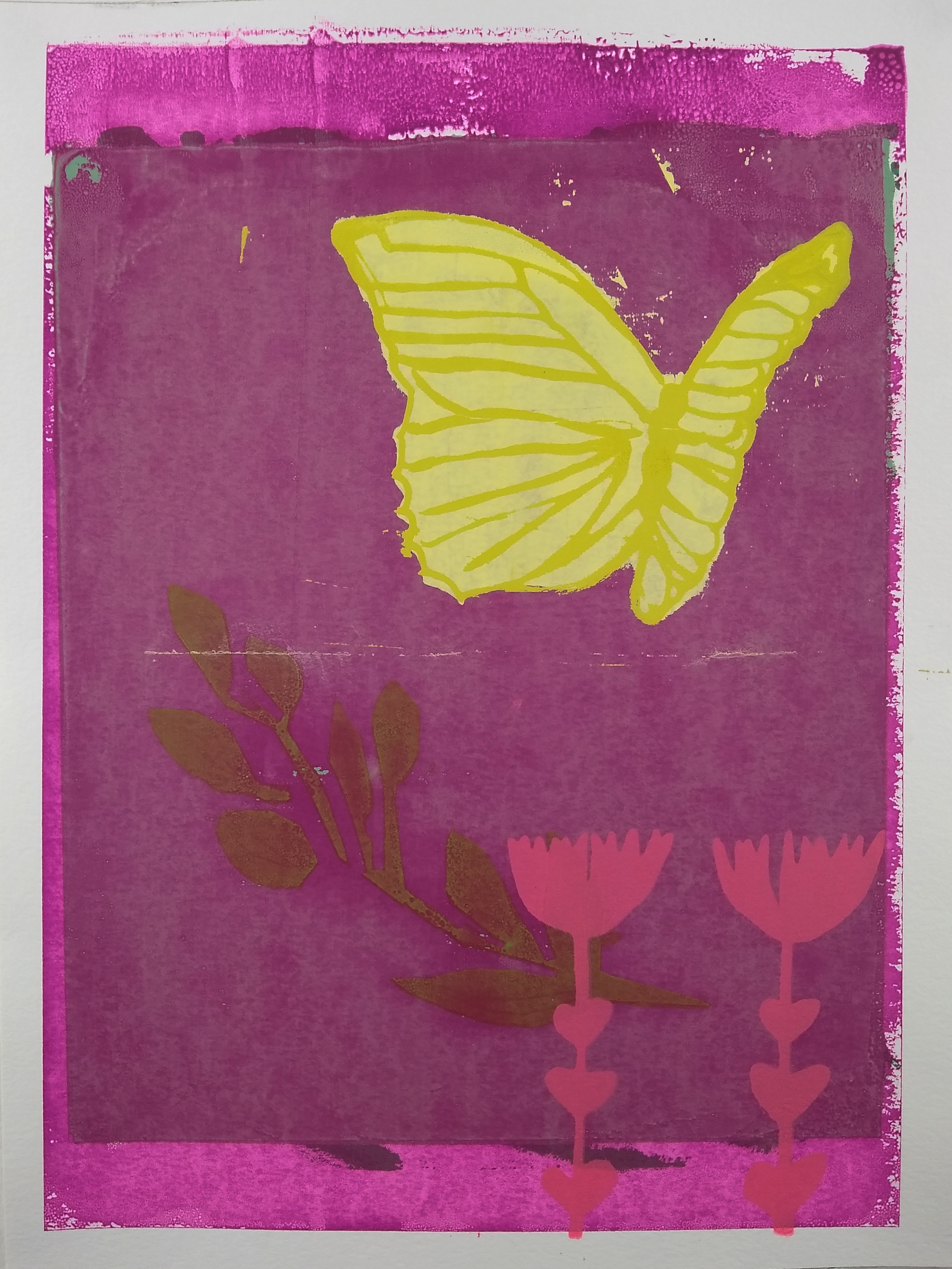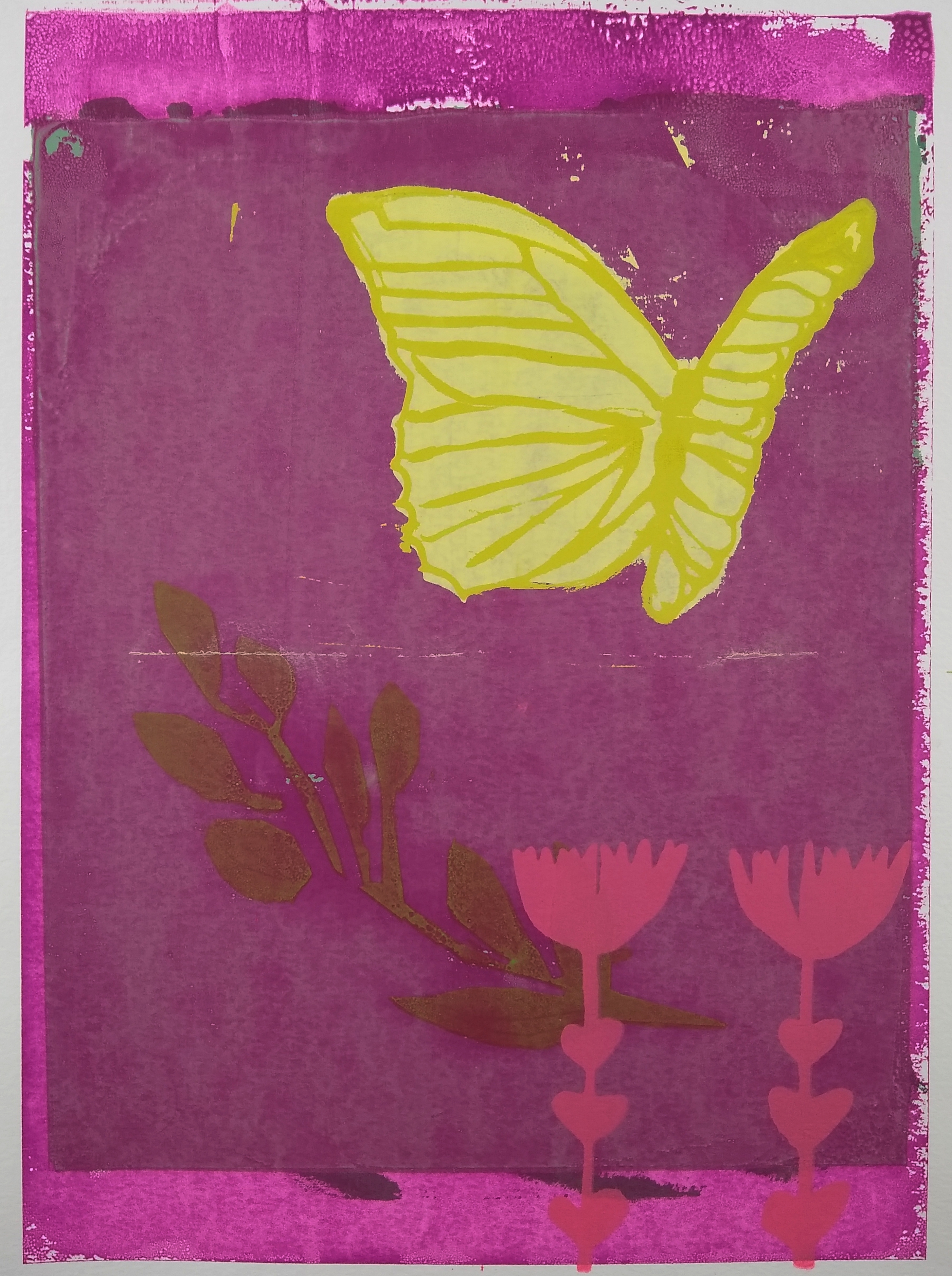 I felt that something was still missing from my magenta butterfly print, so I added a bright pink floral layer to the foreground. Printmaking is a work in progress and you can add elements from various prints if you still have the layer saved on your silkscreen.