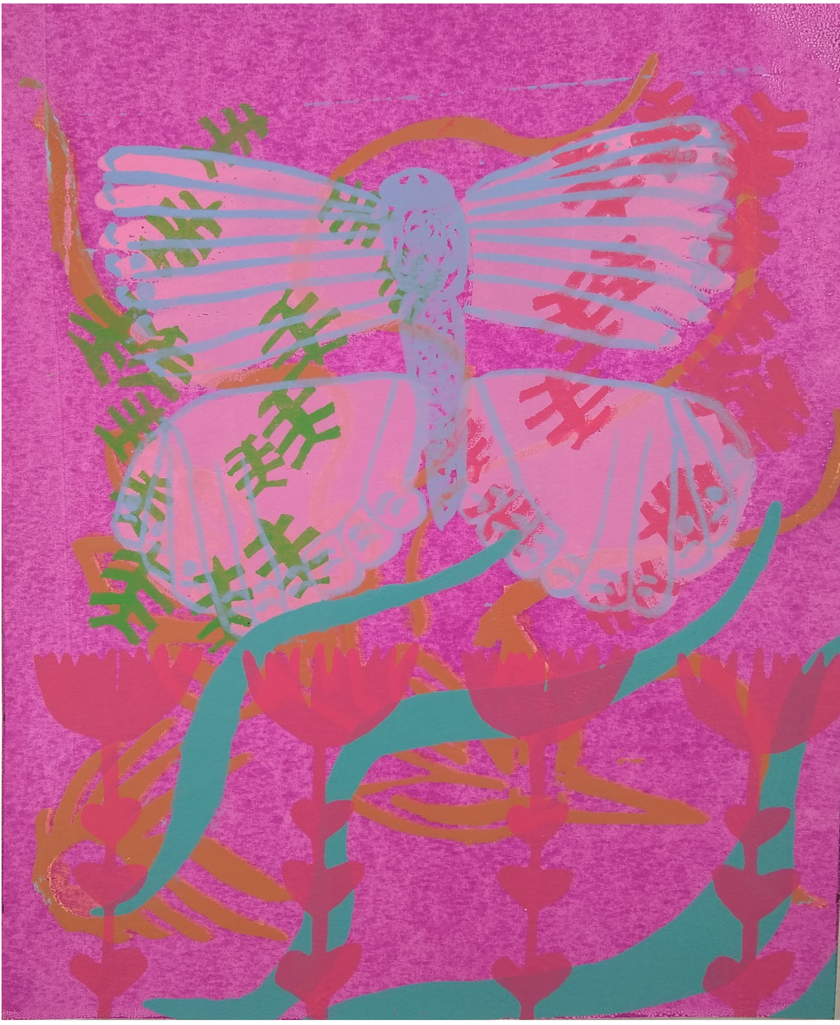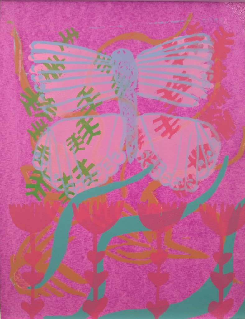 This was a print I did as an experimentation during my butterfly series. It is one of a kind. The colors are wild and remind me of the thick humidity in Florida and everything summer related. Flamingo lawn ornaments, folding lawn chairs, the sound of a lawnmower, a hammock. For me this print captures all of those sounds and feelings.